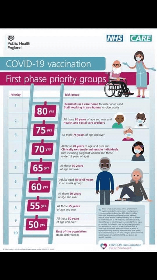 I would stress again that we are restricted to vaccinating patients within the national Cohorts and we are still spending a number of hours explaining to patients why we are unable to step outside this. This is taking a large amount of our receptionist’s time and so would politely request that if you are unsure of your eligibility, please take a look at the cohort illustration I will post below.