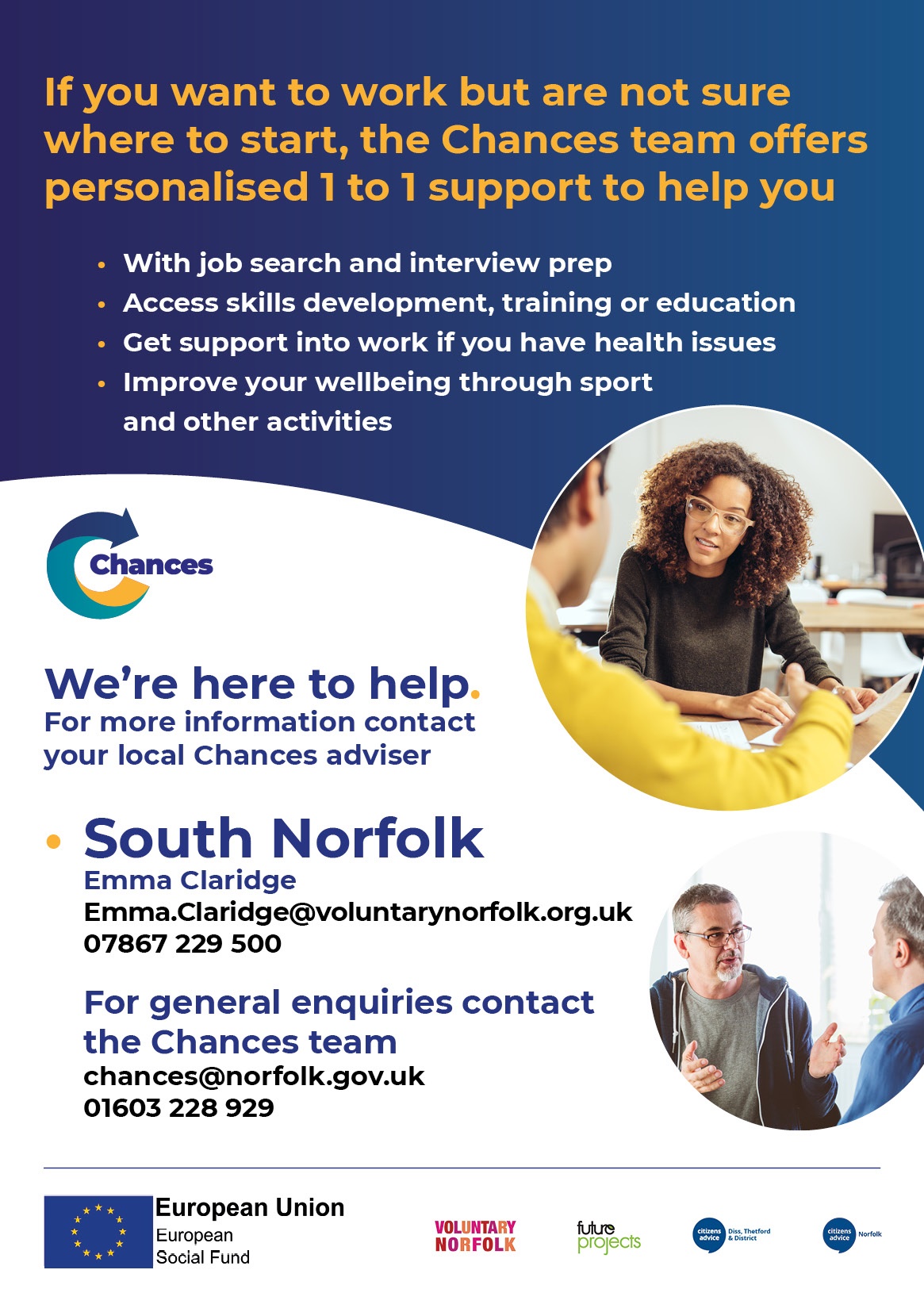 The Chances project delivers personalised employment support to people across Norfolkj. The project supports people both near to and far from work, including those seeking help with health conditions, employability skills, or a lack of self-confidence.