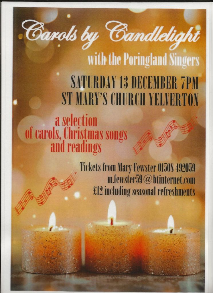 Come along to Carols by Candlelight with the Poringland Singers, Saturday 13th December 7pm, St Mary’s Church Yelverton. A selection of carols Christmas songs and readings, with tickets including seasonal refreshments!